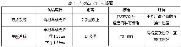 目前日本的FTTH主要有兩種應(yīng)用方式[2],一種是點對點方式,采用以太網(wǎng)技術(shù),主要用于多住戶單元接入(Multi Dwelling Unit Access)。這種接入方式又被分為兩種,一種是單纖系統(tǒng),另一種是雙纖系統(tǒng)。這兩種系統(tǒng)的比較見表1。
