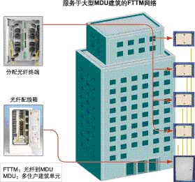 圖1 FTTM結(jié)構(gòu)與單住戶PON相似。對于小型的MDU建筑,MDU光纖終端可以安裝在建筑的外面。單獨(dú)的光纜把此終端與建筑物內(nèi)個(gè)別的訂戶連接起來。