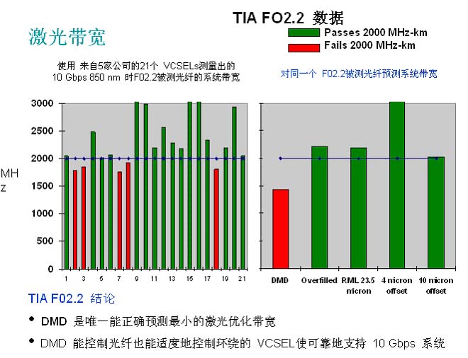 滿溢帶寬對(duì)激光發(fā)送器(通常使用于155Mb/s以上的應(yīng)用中)的最小帶寬性能承載能力較小,因?yàn)檫@些發(fā)送器的啟用條件相差甚遠(yuǎn),且通常無滿溢條件。RML帶寬也遭遇同樣的問題。開發(fā)RML實(shí)驗(yàn)的研究得出的結(jié)論僅適用于62.5µm光纖,只有當(dāng)與滿足特定啟用條件的發(fā)送器一起使用時(shí)才有效。沒有任何一項(xiàng)應(yīng)用采用這些啟用條件,研究顯示不滿足啟用條件的發(fā)送器普遍存在。最后,依賴對(duì)少部分光纖進(jìn)行試驗(yàn)而得出的結(jié)論,無法證明制造商知道該如何選擇優(yōu)良的性能。您必須提出質(zhì)疑。以下來自 TIA F02.2的測(cè)試數(shù)據(jù)和結(jié)論可以清楚地看到同一根光纖采用RML或其他的方法得到的帶寬可能遠(yuǎn)超過2000 MHz-km,但其DMD激光帶寬則更本達(dá)不到2000 MHz-km。