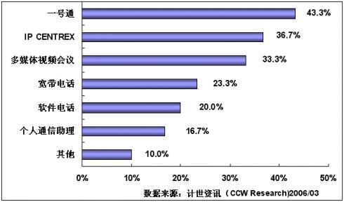 通過計(jì)世資訊(CCW Research)的調(diào)研可以看到,行業(yè)用戶對一號(hào)通、IP-CENTREX、多媒體視頻會(huì)議和寬帶電話等基于NGN平臺(tái)開發(fā)的業(yè)務(wù)比較感興趣,其中:對一號(hào)通感興趣的用戶達(dá)到43.3%,對IP-CENTREX感興趣的用戶為36.7%,對多媒體視頻會(huì)議感興趣的用戶達(dá)到33.3%,對寬帶電話感興趣的用戶達(dá)到23.3%,對軟件電話感興趣的用戶達(dá)到20.0%,對個(gè)人通信助理感興趣的用戶達(dá)到16.7%。