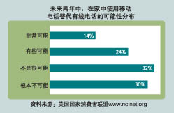 美國國家消費者聯(lián)盟(NCL)對全美消費者對通信業(yè)務(wù)產(chǎn)品的喜好和消費傾向做了一個調(diào)查,涵蓋的業(yè)務(wù)包括無線電話、有線電話、付費電視、互聯(lián)網(wǎng)等。調(diào)查結(jié)果顯示:在948位受訪者中,39%稱自己非常可能或者有些可能在未來的兩年內(nèi)停用自己家中的有線電話,轉(zhuǎn)而使用無線電話。(在1,000位受訪者中,948位是有線電話用戶)。