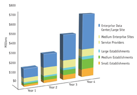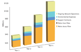 1. 光以太MAN在迅速獲得高利潤的同時能保持穩(wěn)定的收入增長。第一年收入就可以達到1億5千萬美元,到了第四年,收入將達到6億5千萬美元,并且從第一年的第二季度開始,ROI就維持在400%左右。