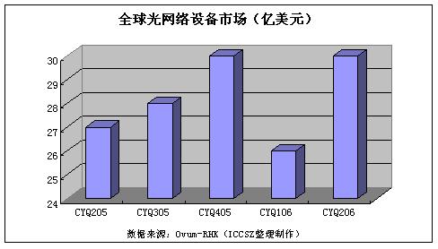 2006年8月16日,Ovum-RHK公司今天公布了2006年第二季度光網(wǎng)絡(luò)設(shè)備供應(yīng)商的初步分析報(bào)告,報(bào)告顯示,二季度全球光網(wǎng)絡(luò)設(shè)備銷售收入達(dá)到30億美元,光網(wǎng)絡(luò)設(shè)備收入比上一季度增長18%,比去年同期增長11%。
