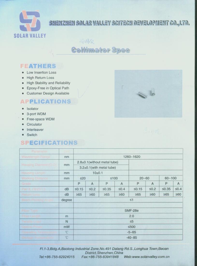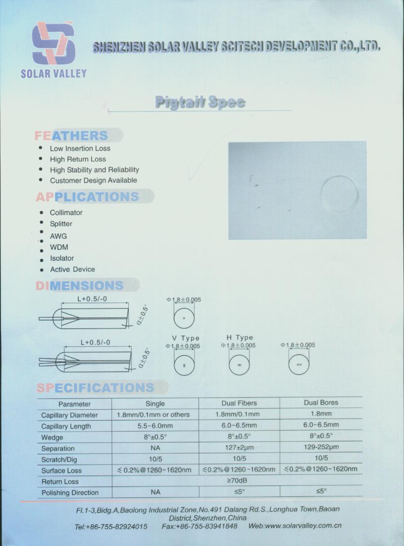 自營產(chǎn)品:Coupler 用石英基板、石英圓管、不銹鋼外管;Pigtail 用毛細(xì)管;Collimator、Isolator 用玻璃圓管、金屬件;各種規(guī)格、形狀的石英、玻璃、金屬件(可按客戶圖紙生產(chǎn))。 獨(dú)家代理:美國F&D公司各種規(guī)格毛細(xì)管 經(jīng)銷 :Raychem(瑞肯)熱塑套管、Corning光纖 公司于2001年8月遷址龍華高新區(qū),廠房面積1800平方米。公司在研發(fā)和生產(chǎn)方面投入了大量資源,吸引了一批經(jīng)驗(yàn)豐富、富有創(chuàng)新精神的專業(yè)人才。公司建立了嚴(yán)格的質(zhì)量保證體系并通過ISO9001:2000版質(zhì)量管理體系認(rèn)證審核。 在光博會(huì)上,天陽谷科技展出的新產(chǎn)品如下: