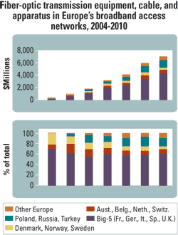 KMI分析師預(yù)測(cè),歐洲的光傳輸設(shè)備、電纜及器件市場(chǎng)將以49%的年復(fù)合增長(zhǎng)率(CAGR)增長(zhǎng),從2005年的4.5億美元,增長(zhǎng)到2010年的70.5億美元。