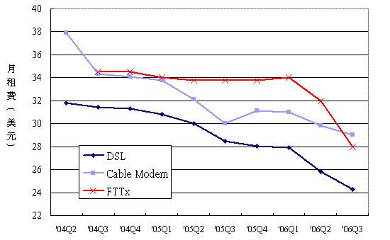 Point-Topic依據(jù)今(2006)年第三季的全球?qū)拵зM率指針調(diào)查研究,指出一項寬帶新趨勢。該項新趨勢為全球FTTx服務的價格有顯著地下降,同時第三季時,光纖上網(wǎng)的價格明顯低于Cable,顯示FTTx相對具有價格競爭優(yōu)勢。