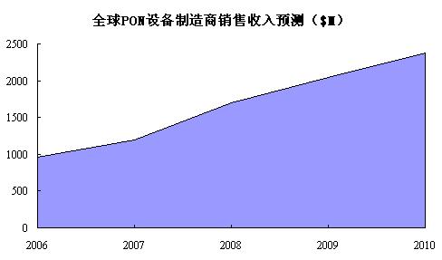 BPON設(shè)備銷售收入下降的同時EPON和GPON設(shè)備銷售收入飛速增長。報告預(yù)測,在2006到2010這5年間,GPON設(shè)備銷售收入及端口出貨量將以三位數(shù)的年復(fù)合增長率增長。報告還預(yù)測,EPON和GPON設(shè)備銷售收入在今后的五年還將繼續(xù)快速增長,并在2010年達(dá)到24億美元。