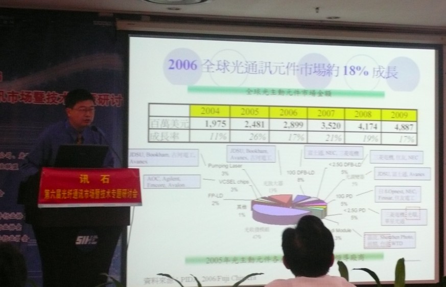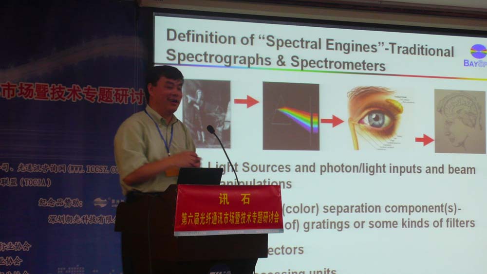 訊石邀請到的另外一位講師是新加坡南洋理工大學沈平教授,他給大家?guī)淼氖切录悠鹿馄骷?、系統(tǒng)及網(wǎng)絡技術發(fā)展的一些情況。高意科技近年來一直保持著高速的增長率,2006年銷售額達六億人民幣,對于這樣一個高速發(fā)展的企業(yè),訊石特別邀請到高意科技集團公司總裁凌吉武先生,凌總認為影像是光電子產(chǎn)業(yè)的推動力,影像的發(fā)展也勢必會帶動帶寬的需求,以至帶動整個光通訊行業(yè)的發(fā)展。凌總分析了目前的通訊熱點及產(chǎn)品需求,他透露BPON、GPON產(chǎn)品將以每年50%的速度增長,其中RODAM產(chǎn)品需求增加有200%。除此外凌總也簡單介紹了高意科技公司的一些情況,在現(xiàn)場提問中凌總透露公司準備在國外上市。美國BaySpe公司總裁楊巍博士給大家講敘了一個新興技術的發(fā)展《微型化光譜引擎在電信及其他更廣泛行業(yè)中的應用》,演講中提到的光譜分析對于糖尿病的檢查將在未來發(fā)揮不可估量的作用,帶來新的商機,這也引起了大家的興趣。