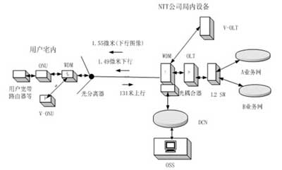 圖中OSS為運(yùn)行維護(hù)操作系統(tǒng),負(fù)責(zé)系統(tǒng)的維護(hù)管理和故障定位,DCN為局內(nèi)數(shù)據(jù)網(wǎng),OSS系統(tǒng)通過(guò)DCN網(wǎng)完成對(duì)系統(tǒng)地管理,OLT是光線路終端設(shè)備,ONU是光用戶網(wǎng)絡(luò)單元,V-ONU是光用戶圖像網(wǎng)絡(luò)單元,L2 SW是鏈路層轉(zhuǎn)換開(kāi)關(guān),其它設(shè)備如光分離器、耦合器和光濾波器等前面已作了介紹。在早期由于建設(shè)了大量的ATM設(shè)備,因此NTT就采用了B-PON(基于ATM平臺(tái)的寬帶無(wú)源光網(wǎng)絡(luò))系統(tǒng)與之配套,由于它的系統(tǒng)成本高,和因特網(wǎng)的親和性不好,因此現(xiàn)在改用GE-PON(千兆畢以太網(wǎng)無(wú)源光網(wǎng)絡(luò))系統(tǒng),由于現(xiàn)在網(wǎng)中的話務(wù)量大都是IP數(shù)據(jù)包,因此 GE-PON系統(tǒng)就有巨大的優(yōu)越性。同時(shí)還有一點(diǎn)要說(shuō)的,就是日本與外國(guó)不同,用戶光纖傳輸系統(tǒng)采用單纖方式,而不是雙纖方式。