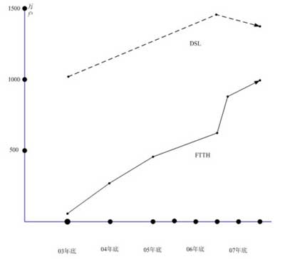 從2005年第一季度開(kāi)始,到2006年第二季度連續(xù)6個(gè)季度,FTTH的用戶增加量都超過(guò)了ADSL的增加量,同時(shí)到2006年第二季度,ADSL就出現(xiàn)了負(fù)增長(zhǎng)。