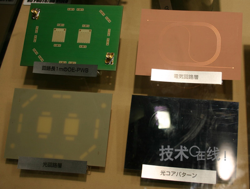 試制的印刷底板為明信片大小,旋渦狀配置了斷面為40μm見(jiàn)方、長(zhǎng)度為1m的光導(dǎo)波路。采用850nm波長(zhǎng)的光線時(shí),包括光導(dǎo)波路兩端的反光鏡在內(nèi)的光路損失為12dB。松下電工認(rèn)為,這種程度的損失已經(jīng)達(dá)到實(shí)用水準(zhǔn)。薄膜材料為采用環(huán)氧樹(shù)脂制成,可同時(shí)用于剛性底板和柔性底板。主要面向?qū)盈B材料的多層印刷底板。