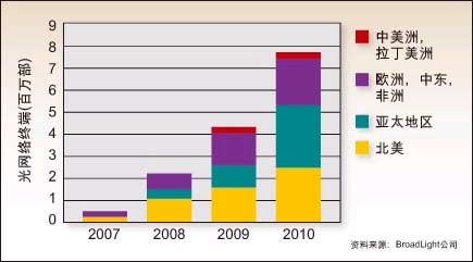 圖1:GPON終端將穩(wěn)步起飛。到2011年,全球GPON設(shè)備的年出貨量有望超過1千萬部。
