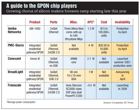 ConexantSystems公司和PMC-Sierra公司目前都已開發(fā)出此類芯片。BroadLight公司計(jì)劃在今年4月開始其芯片的量產(chǎn)。飛思卡爾半導(dǎo)體公司則聲稱將在2009年的某個(gè)時(shí)候量產(chǎn)。