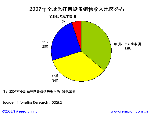 上圖為2007年全球光纖網(wǎng)設(shè)備銷售收入地區(qū)分布圖