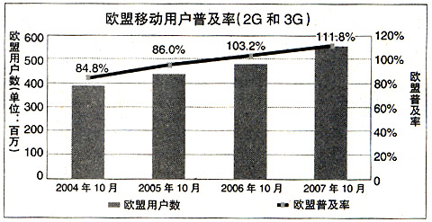 2007年,歐盟移動業(yè)務(wù)總收入從2006年的1330億歐元上升到1370億歐元,增幅為3.8%,略低于2006年的增長幅度(4.1%),而移動電話普及率則持續(xù)上升,平均普及率已從2006年的103.2%升至111.8%。