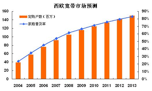西歐寬帶服務訂購戶數2009年底將達到1.15億,2013年將增長至近1.5億。