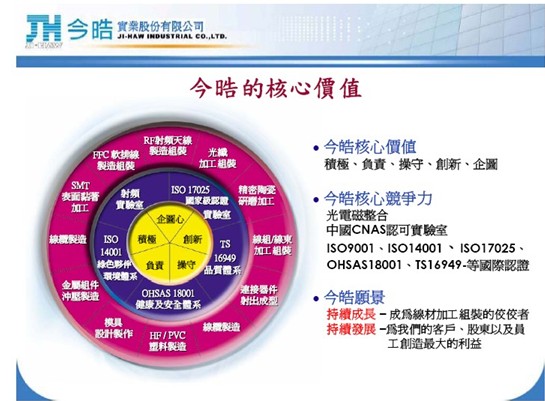 跳線產(chǎn)品方面,今皓于 2003 年開始自制插芯,大約 2004 年開始有跳接線的生產(chǎn)能力。今皓一直保持著自己自制插芯的優(yōu)勢,獲得很多長期穩(wěn)定的海外訂單,盡管去年受到金融危機影響,但跳線這塊的收入都是持續(xù)增長的。跳線的優(yōu)良品質(zhì)也同樣離不開產(chǎn)品品質(zhì)的保證,制作陶瓷插芯的同心度檢測機都是從瑞士引進的。林總補充介紹說,從整體來看,今皓的產(chǎn)品都可以自行研發(fā)生產(chǎn),同時公司還擁有自己的模具廠和射頻廠。他用以下這張圖片全面展示了公司的核心價值:
