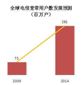 寬帶電信服務(wù)的年增速高達(dá)31%,全球用戶數(shù)量從2009年的7,300萬驟增至2014年的 2.81億。而同期ADSL用戶數(shù)量的年增幅預(yù)計為8.4%。而在2014年,ADSL仍將以4.58億用戶繼續(xù)保持領(lǐng)先。