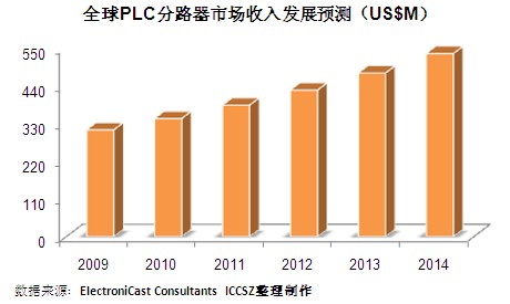PLC Splitter Component-Level Compact Devices )市場收入為3.2億美元。預計在2009年至2014年期間,該產(chǎn)品銷售額將以11.4%的年復合增長率增長,截止2014年將達到5.35億美元,據(jù)ElectroniCast最新數(shù)據(jù)顯示。