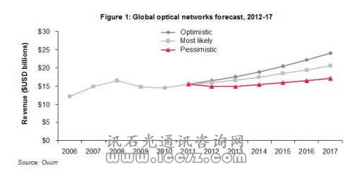【訊石光通訊咨詢網(wǎng)】Ovum預(yù)測,由于數(shù)據(jù)中心日益增長的帶寬需求,長期來看光網(wǎng)絡(luò)硬件市場前景光明。2012到2017年間,光網(wǎng)絡(luò)系統(tǒng)銷售額將以5%的CAGR(年均復(fù)合增長率)增長,達(dá)200億美元。