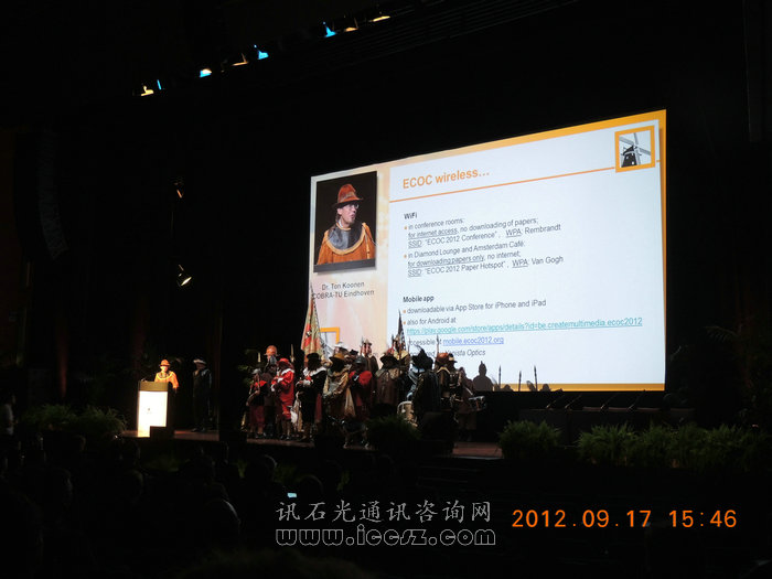 本次展會所在地AMSTERDAM RAI展館,本屆ECOC展在第一層,所以相比往年還有兩層的展館,今年的展覽面積似乎縮小了。展館遠望去都是玻璃結構為主,真正的用途卻是“節(jié)能、環(huán)保”,在展館開放的時候,館內的燈光逐步暗下來,整個展館借助屋頂的玻璃,利用太陽光來照明,非常環(huán)保。尤其到中午時分,絲絲陽光灑落下來,整個展館既明亮又溫暖。 參加ECOC2012開幕式,給人耳目一新的感覺,這在國內是不多見的,沒有場面宏大的典禮現場,也沒有衣著正式的干部領導,在舞臺上開幕的主持人著裝是如此“怪異”,舞臺后的團隊是開幕表演的皇家樂隊。但這樣的開幕似乎更吸引人眼球,而關于展會的實用信息(展館介紹,研討會安排,無線網絡使用等)一應俱全,一一介紹。