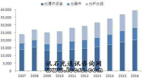 據ICCSZ統(tǒng)計的數(shù)據顯示,2011年全球光通信市場產值達到近280億美元的規(guī)模,年增幅近8%。其中光器件占20%(約54億美元)、光纖光纜占30%(約86億美元)、光通信設備占50%(約140億美元)。
