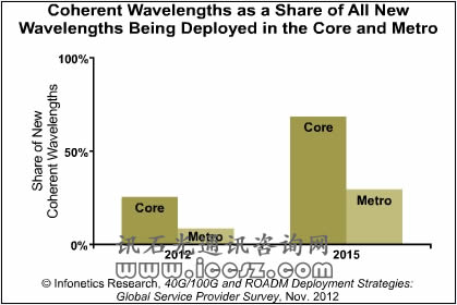在調(diào)研反饋中,到2015年相干波長(zhǎng)在核心網(wǎng)中占到68%,在城域網(wǎng)中占到29%。100G部署波長(zhǎng)將從2012年僅僅5%上升到37%。