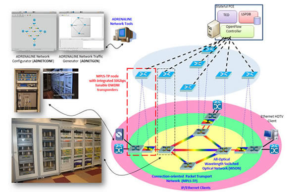 CTTC ADRENALINE測試平臺在一4結(jié)點(diǎn)波長交換光傳輸網(wǎng)絡(luò)上演示MPLS-TP接入和匯聚網(wǎng)絡(luò)。多層網(wǎng)絡(luò)能夠被一分布式GMPLS控制平臺或集成狀體的PCE/OpenFlow集中控制平臺所控制。