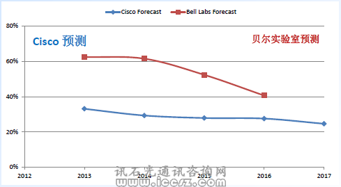 從圖中可以看出,Cisco的預(yù)測(cè)保守得多而貝爾實(shí)驗(yàn)室的預(yù)測(cè)更樂(lè)觀,他們認(rèn)為增長(zhǎng)率放緩的幅度更大。