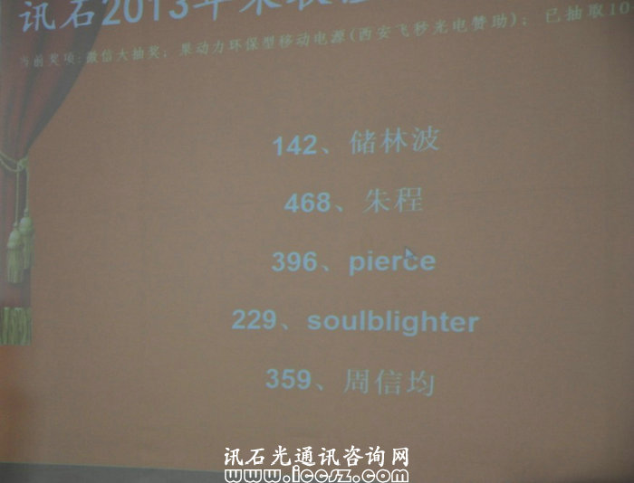 活動期間,飛秒光電科技(西安)有限公司的李總在現(xiàn)場為大家抽取了五名微信用戶,獎品為果動力移動電源。由于第一遍沒有抽到在場觀眾,現(xiàn)場觀眾熱烈請求李總再抽一次,遺憾的是,仍未抽到現(xiàn)場觀眾?,F(xiàn)公布中獎微信用戶名單如下:儲林波、朱程、pierce、soulblinghter、周信均,還望中獎用戶及時聯(lián)系訊石領取獎品,領獎日期截至2014年1月20日。聯(lián)系電話:0755-82960080