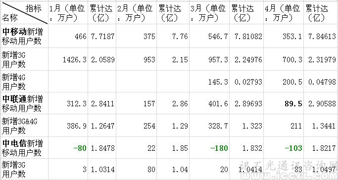ICCSZ訊(編輯:Debi)在“5·17世界電信日發(fā)放FDD牌照”的風(fēng)暴過去后,國內(nèi)電信業(yè)并未歸于平靜,反而隨著中國聯(lián)通、中國移動相繼公布4月份運(yùn)營數(shù)據(jù)變得熱鬧起來——中國移動并沒有高歌猛進(jìn),中國聯(lián)通4月新增移動用戶數(shù)創(chuàng)5年來新低,中國電信則頻頻出現(xiàn)移動用戶數(shù)凈減的尷尬境地。
