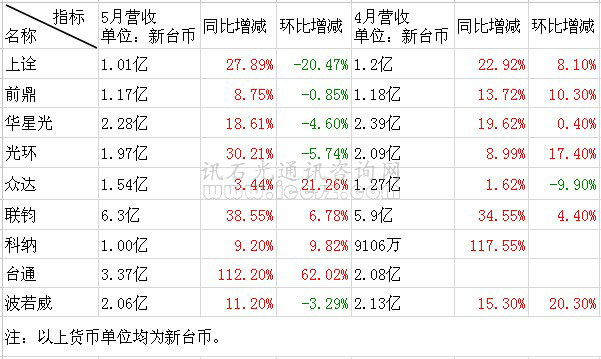 臺(tái)光通信商5月?tīng)I(yíng)收增減情況
