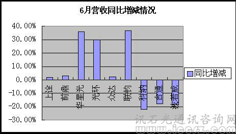 從已公布的6月營收情況來看,臺灣光通信企業(yè)同比去年增減不均,近七成同比去年上漲,科納、臺通、波若威三家同比下降,尤以科納下滑最甚,6月營收7176.7萬元(新臺幣,下同),同比下降22%。