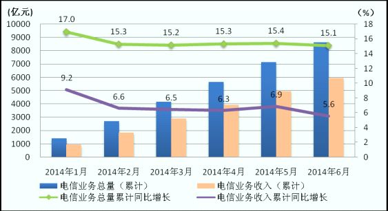 圖1.2014年1-6月電信業(yè)務(wù)總量和電信業(yè)務(wù)收入發(fā)展情況