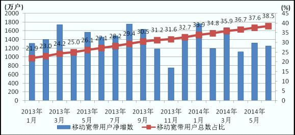 圖2.2013-2014年移動寬帶用戶當(dāng)月凈增數(shù)和占比情況