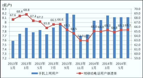圖4 2013-2014年各月手機上網(wǎng)用戶和對移動電話用戶滲透率情況
