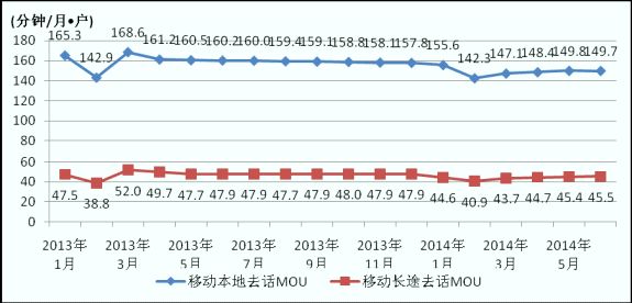 圖5. 2013-2014年各月移動本地和長途去話MOU值比較
