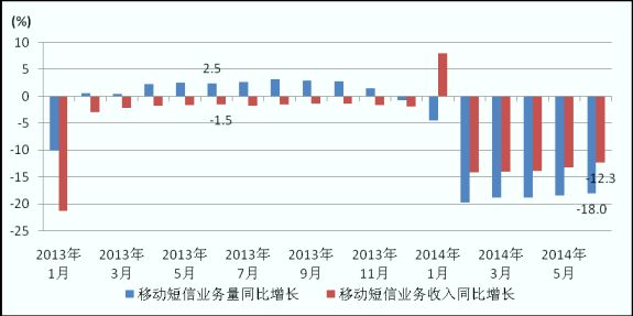 圖6. 2013-2014年各月移動短信業(yè)務(wù)量和移動短信收入同比增長情況