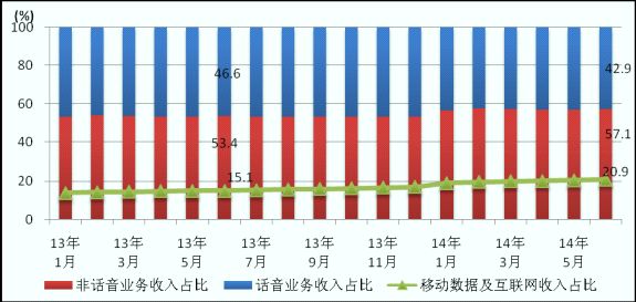圖8 2013年-2104年各月話音、非話音、移動數(shù)據(jù)業(yè)務(wù)收入占比情況