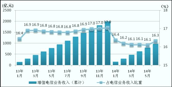 增值業(yè)務(wù)收入增速低于電信業(yè)務(wù)收入增速,收入占比略有下降。1-6月,基礎(chǔ)企業(yè)增值電信業(yè)務(wù)收入規(guī)模達(dá)1133.4億元,增長4.2%,低于電信業(yè)務(wù)收入增速1.4個百分點,比上年同期下降1.5個百分點。占電信業(yè)務(wù)收入的比重較上年同期下降0.3個百分點,達(dá)19%。移動增值業(yè)務(wù)收入增速比上年同期下降2.4個百分點,達(dá)2.9%,規(guī)模達(dá)到972億元。固定增值業(yè)務(wù)收入增速比上年同期提高4.6個百分點,達(dá)到13.2%,規(guī)模達(dá)到161.4億元,占增值業(yè)務(wù)收入的比重由上年同期的13.1%提升至14.2%。