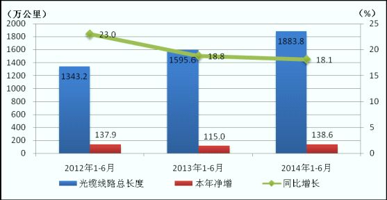 圖12 2012-2014年1-6月光纜線路總長度發(fā)展情況
