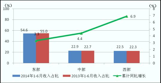 圖13 2014年6月東、中、西部電信主營業(yè)務(wù)收入同期比較
