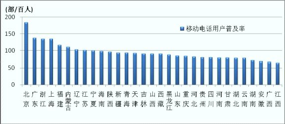 6月,東、中、西部地區(qū)移動電話普及率分別達(dá)到111、77、82.9部/百人,分別比上年末提高1.2、3.3、2.9部/百人。東部與中西部的移動電話普及率差距小幅收窄,各地區(qū)之間差距依然明顯。全國共8省市移動電話普及率超過100部/百人,其中7省市集中在東部地區(qū)。北京市移動電話普及率高達(dá)182.7部/百人,比上年末提高23.2部/百人。遼寧、廣東、山東等6省市的移動電話普及率比上年末出現(xiàn)下降,移動電話用戶數(shù)的“天花板效應(yīng)”日益凸顯。