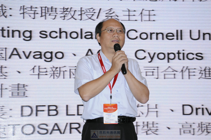 隨后,臺灣清華大學(xué)副校長劉容生教授發(fā)表題為《天羅地網(wǎng)、從云到端看光通訊發(fā)展的新契機(jī)》的演講,劉教授反復(fù)提到的觀點(diǎn)即“跳出模子思考問題,或許別有洞天”,其次“也要知道敵人在哪里”,劉教授還提到做CMOS應(yīng)該從元件結(jié)構(gòu)上思考,也許會有突破。主持人陳益新教授總結(jié)道,劉教授主要回顧了互聯(lián)網(wǎng)的發(fā)展歷史,并概括了幾大趨勢(互聯(lián)網(wǎng)無處不在,物聯(lián)網(wǎng)無所不能),而當(dāng)前最前延的研究就是硅光子。此外,劉教授也建議大家在硅光子產(chǎn)業(yè)上建立一條完整的產(chǎn)業(yè)鏈,希望大家能一起努力。并認(rèn)可了VCSEL目前及未來的可觀前途。
