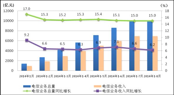 圖1.2014年1-8月電信業(yè)務(wù)總量和電信業(yè)務(wù)收入發(fā)展情況