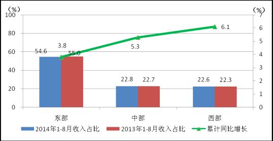 圖10 2014年8月東、中、西部電信業(yè)務(wù)收入同期比較
