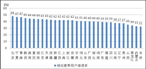 8月,東、中、西部地區(qū)移動(dòng)寬帶(3G/4G)用戶分別比上年末凈增5188.6、2800.1、2816.1萬(wàn)戶,凈增用戶占比分別為48%、25.9%、26.1%。東中西部地區(qū)移動(dòng)寬帶用戶普及情況差異不大,東部地區(qū)移動(dòng)寬帶用戶滲透率最高,達(dá)40.2%,分別比中西部地區(qū)高1.1、0.3個(gè)百分點(diǎn)。各省之間移動(dòng)寬帶用戶滲透率差異較小,滲透率高于40%的省份占到6成以上,其中北京全國(guó)最高,達(dá)到47.8%,吉林滲透率最低,達(dá)到32.2%。