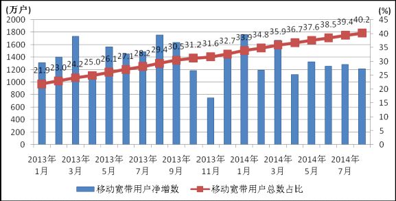圖2.2013-2014年移動(dòng)寬帶用戶當(dāng)月凈增數(shù)和總數(shù)占比情況