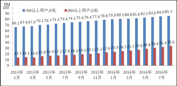 圖3 2013-2014年8月互聯(lián)網(wǎng)寬帶接入速率4M和8M以上用戶占比情況