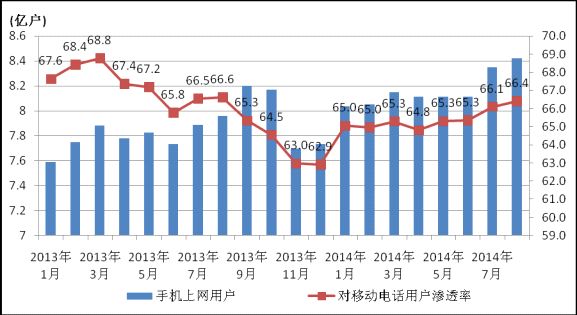 圖4 2013-2014年手機(jī)上網(wǎng)用戶和對(duì)移動(dòng)電話用戶滲透率情況